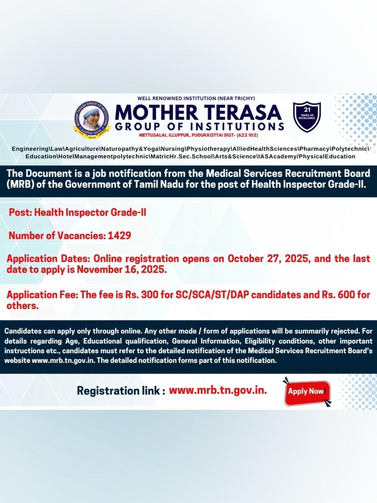 The Tamil Nadu Medical Services Recruitment Board (MRB) has released a notification for 1,429 Health Inspector Grade-II vacancies. Eligible candidates can apply online from October 27 to November 16, 2025, through the official website www.mrb.tn.gov.in